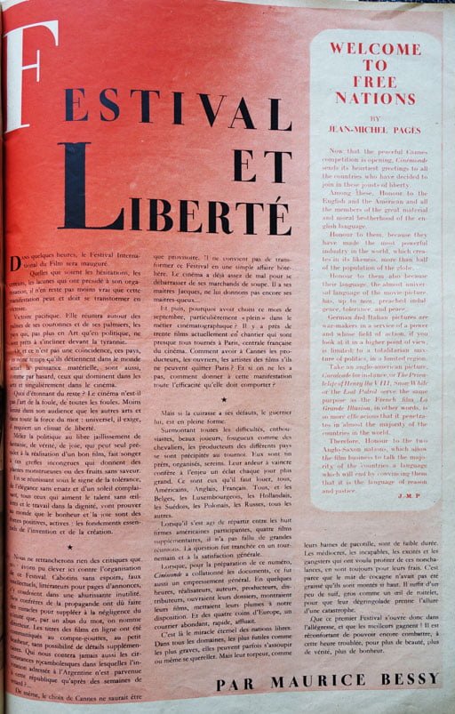 Le 30 août, Cinémonde, sous la plume de Maurice Bessy, titre « Festival et Liberté » pour annoncer les débuts du festival à Cannes. Le message est clair.